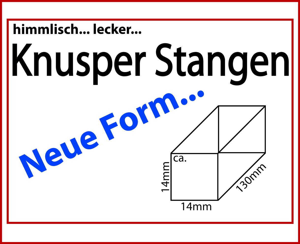 Neue Größe: Unsere Knusperstangen sind erwachse geworden und haben nun die ca. Abmessungen 14mm x 14mm x 120/130mm