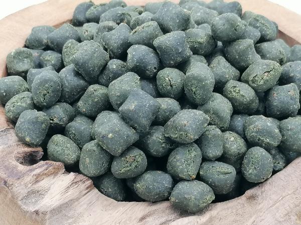 Unsere Knusperkissen Kräuterfisch verbinden geröstetes Lupinen- und Leinsamenmehl mit Hering, Kräutern, Spirulina-Algen und Lachsöl.